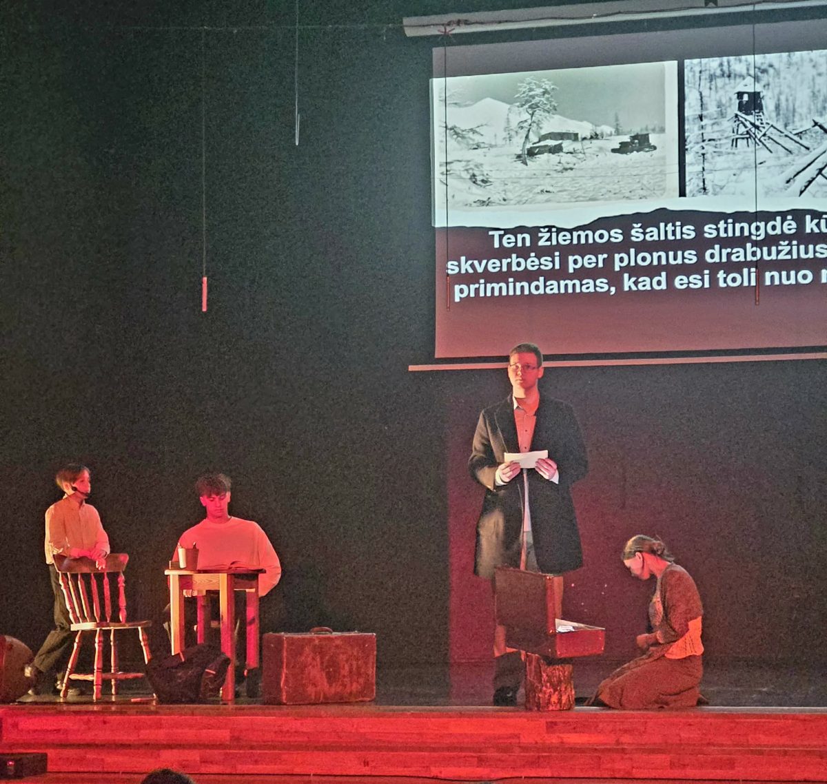 Šventę sveikinimo žodžiu pradėjo gimnazijos direktorė Žaneta Jankovska, o po iškilmingai sugiedoto Lietuvos himno žiūrovai stebėjo meninę kompoziciją, primenančią tremtį, partizanų kovą, laisvės viltį ir istorinę Kovo 11-ąją. Scenoje atsivėrė skirtingų likimų istorijos. Broliai – jaunesnįjį vaidinęs penktokas Benediktas ir vyresnįjį įkūnijęs dešimtokas Simonas – bandė suprasti praeitį ir tai, ką reiškia Kovo 11-oji. Tremtinių istoriją jautriai perteikė dešimtokai Jonas ir Gabrielė, o partizanų ryžtą ir pasiaukojimą scenoje įkūnijo Arijus ir Gražvydas. Scenas lydėjo gimnazijos chorų atliekamos dainos, pradinių klasių mokinių šokis, o ekrane buvo rodomi dokumentiniai kadrai, primenantys tikrus istorijos įvykius. Stebėdami pasirodymą žiūrovai kartu su atlikėjais išgyveno įvairias emocijas: salėje buvo ir susigraudinusių akių, ir šypsenų. Kompozicija priminė, kad į lagaminą kadaise tilpdavo visas žmogaus gyvenimas, tačiau yra dalykų, kurių į jokį lagaminą nesutalpinsi. Vienas iš jų – laisvė.