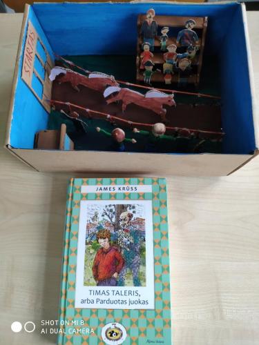 6b1 ir 8b1 pogrupių mokiniai užklasiniam skaitymui renkasi ne tik įdomias knygas, bet ir smagias kūrybines užduotis. Š. m. lapkričio 4, 8 dienomis į lietuvių kalbos pamoką vaikai atėjo ne tik perskaitę knygas, bet ir parengę jų pristatymą „dėžutėse“. Mokiniai į dėžutes įdėjo pagrindinius daiktus, apie kuriuos buvo kalbama skaitytose knygose: tai ir traukinio vagonas su važiuojančiais į Sibirą žmonėmis iš Rūtos Šepečio „Tarp pilkų debesų“, ir hipodromas su žiūrovais iš „Parduoto Timo Talerio juoko“, ir daiktai iš „Strazdo giesmininko“ bei kitų kūrinių.